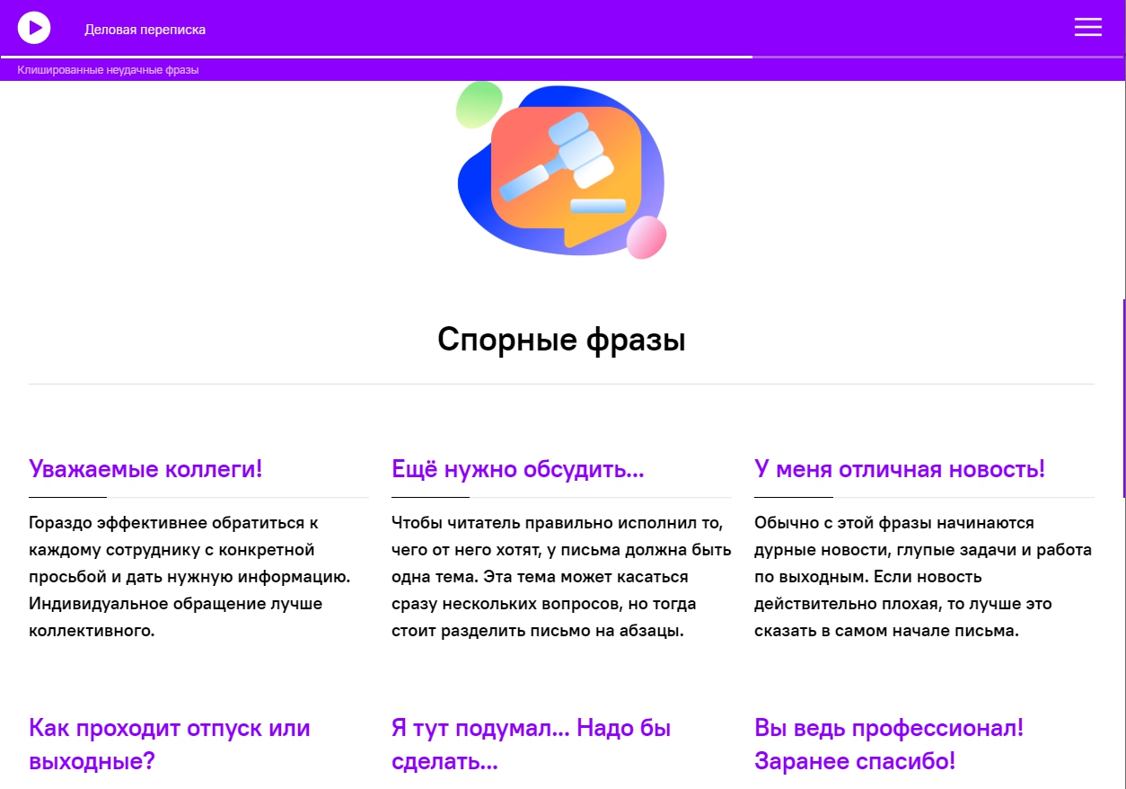 Коллеги, мы довольны проектом Soft Skills и благодарим за взаимосотрудничество! Курсы интересные, динамичные, содержат много полезной и применимой в современной жизни информации. Понравились персонажи, дизайн курсов, а также драйв и юмор, с которым они реализованы. В нашей копании на основе дистанционных курсов Soft Skills реализован on-line проект повышения квалификации сотрудников, главная цель которого дать возможность каждому сотруднику профессионально развиваться, не покидая рабочее место.