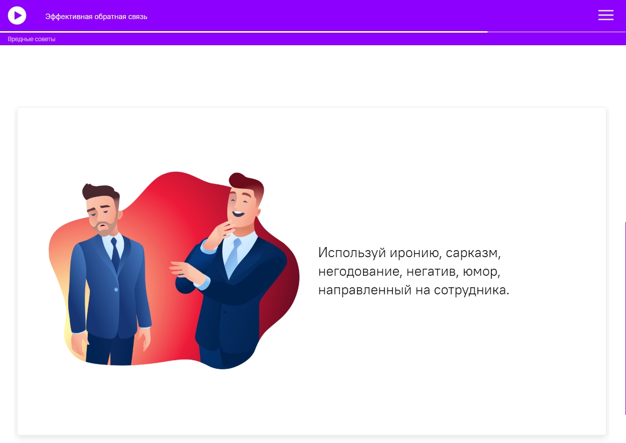 Коллеги, мы довольны проектом Soft Skills и благодарим за взаимосотрудничество! Курсы интересные, динамичные, содержат много полезной и применимой в современной жизни информации. Понравились персонажи, дизайн курсов, а также драйв и юмор, с которым они реализованы. В нашей копании на основе дистанционных курсов Soft Skills реализован on-line проект повышения квалификации сотрудников, главная цель которого дать возможность каждому сотруднику профессионально развиваться, не покидая рабочее место.