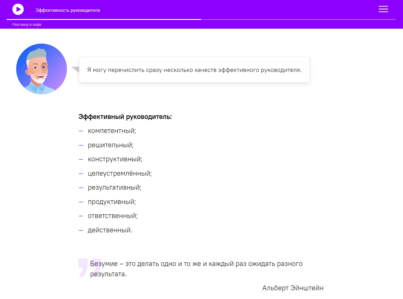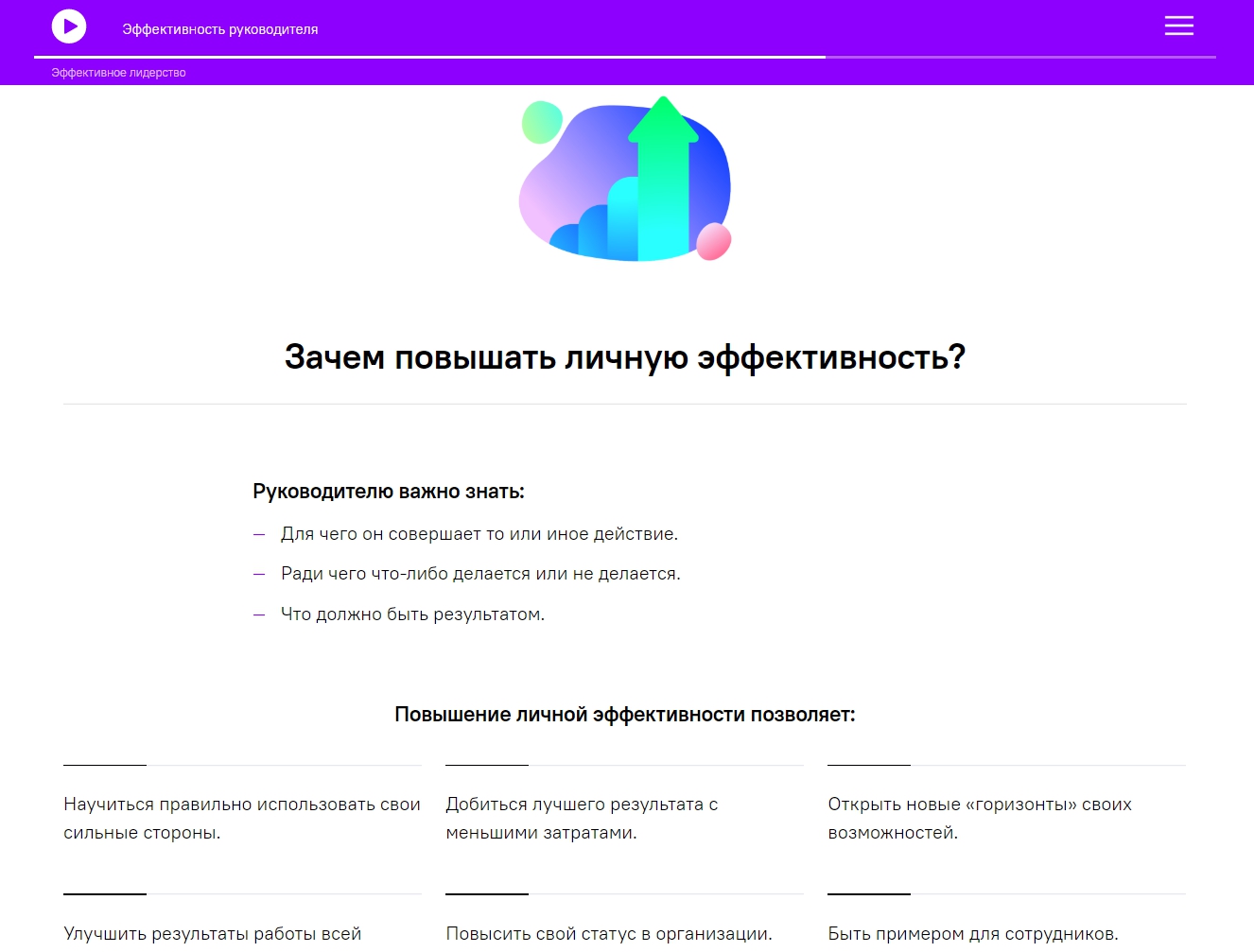 Формирует понимание, как и зачем повышать личную эффективность, знает, что можно изменить в своей работе уже сейчас.
