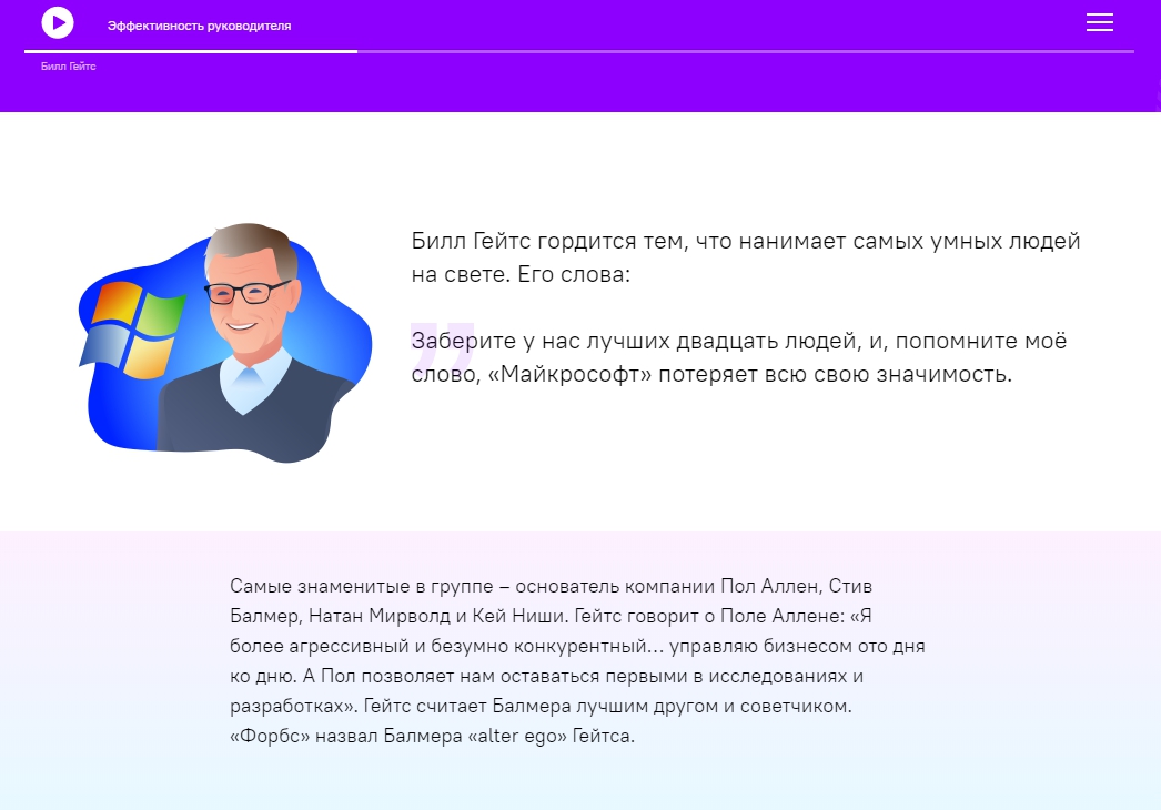 Хороший баланс дизайна и подачи материала. Концентрированные материалы, много лайфхаков, нет воды. Грамотный подход к содержанию, методологии, визуальной составляющей. А на основе курса про "Наставничество" мы планируем разработать программу обучения для сотрудников.