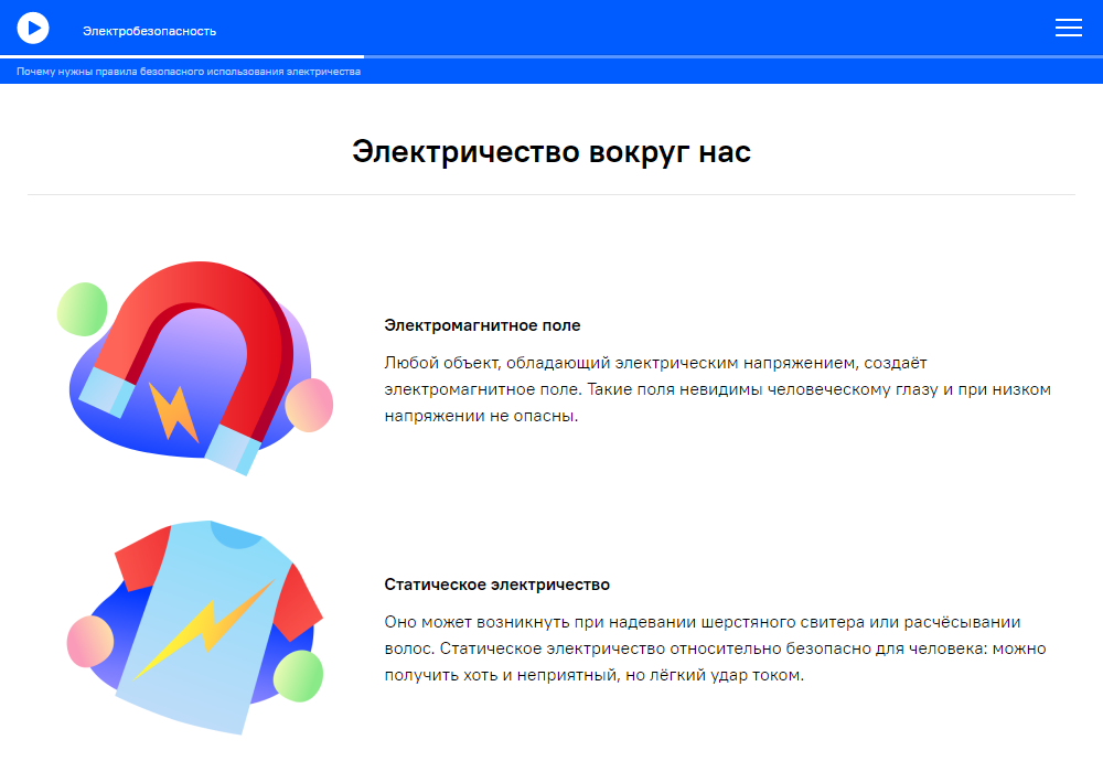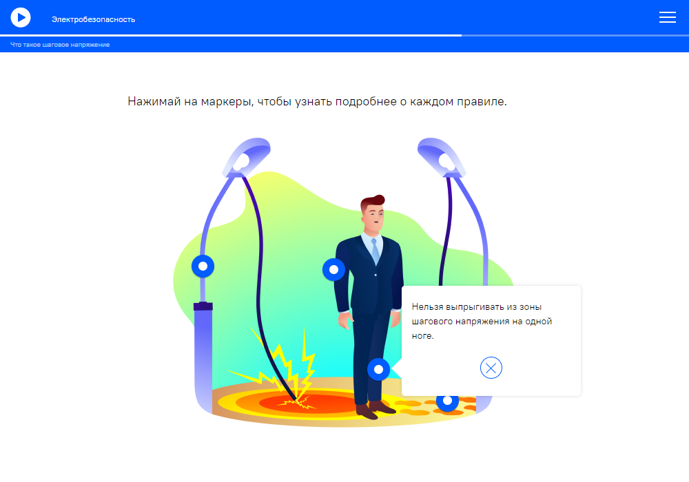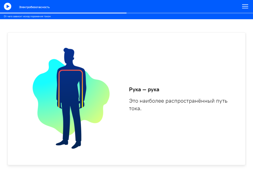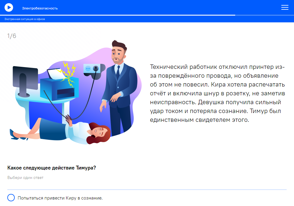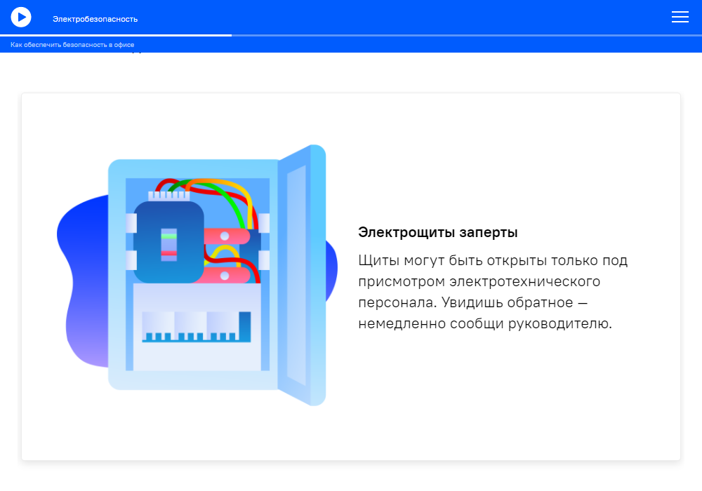 Представьте, что сотрудник вашего офиса пришёл на работу и почувствовал запах неисправной электропроводки. Или стал свидетелем, как коллегу ударило током. Как он поступит в такой ситуации? Будет ли он знать, что делать? Чтобы быть уверенным, что сотрудник сделает всё правильно, нужно познакомить персонал с правилами электробезопасности и убедиться, что они усвоены. Эти задачи решит данный электронный курс.
