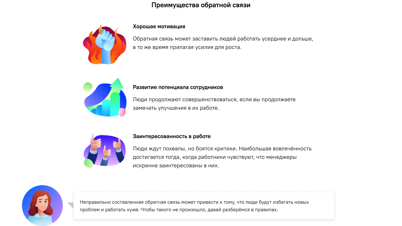 В курсе озвучены названия большей части инструментов, необходимых наставнику. Интерактивная подача материала вызывает интерес и желание пройти обучение до самого конца. Подробно раскрыт блок обратная связь.