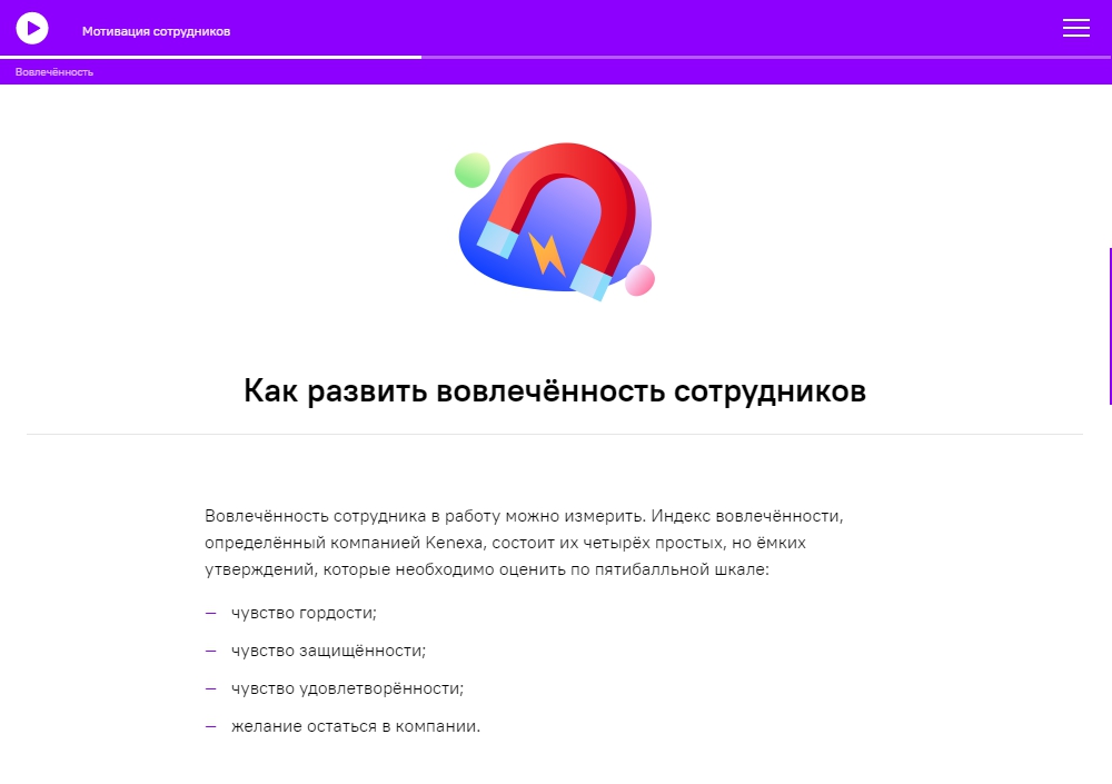 Коллеги, мы довольны проектом Soft Skills и благодарим за взаимосотрудничество! Курсы интересные, динамичные, содержат много полезной и применимой в современной жизни информации. Понравились персонажи, дизайн курсов, а также драйв и юмор, с которым они реализованы. В нашей копании на основе дистанционных курсов Soft Skills реализован on-line проект повышения квалификации сотрудников, главная цель которого дать возможность каждому сотруднику профессионально развиваться, не покидая рабочее место.