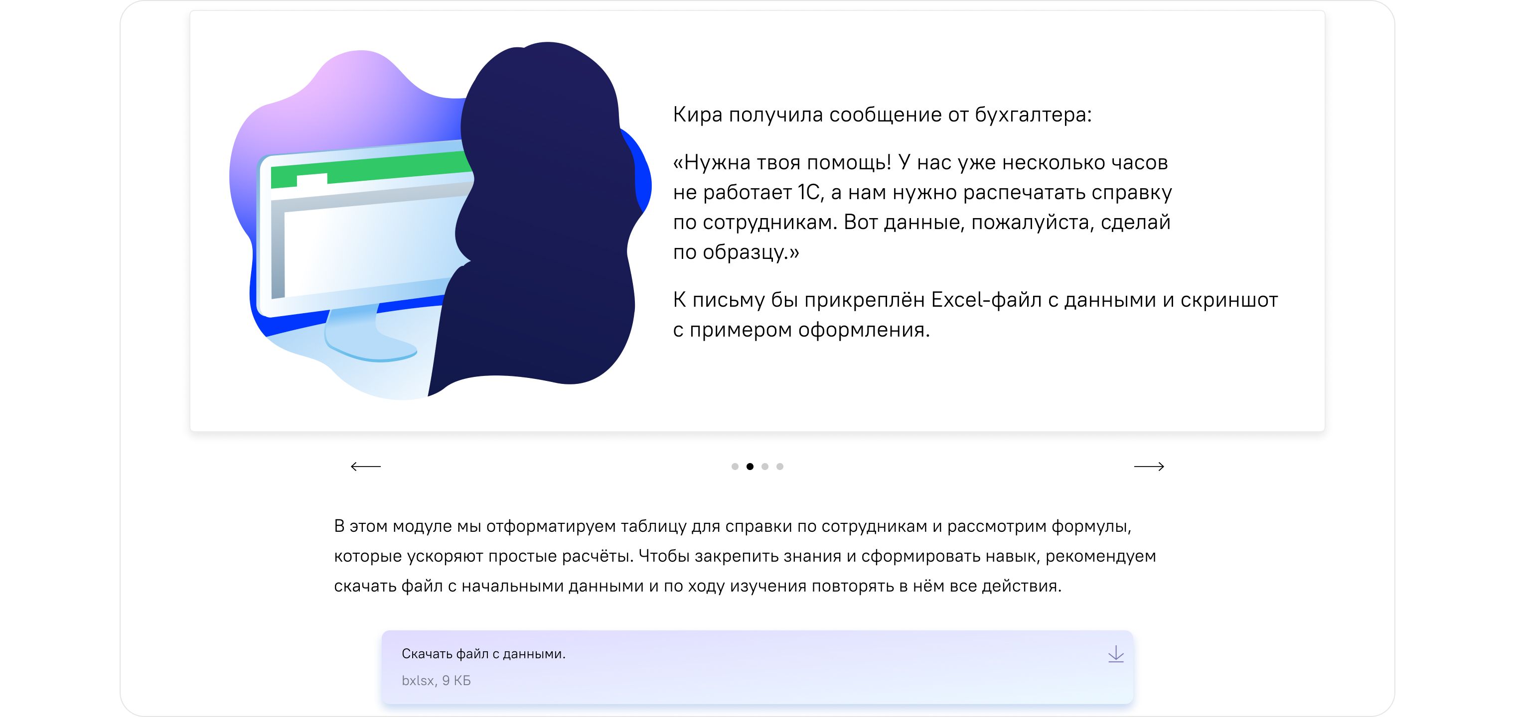 С помощью этого курса сотрудники изучат возможности Редактора таблиц и воспроизведут их в своих рабочих файлах. На практических и домашних заданиях отрабатываются полученные навыки, которые в дальнейшем применяются в работе над данными и таблицами.