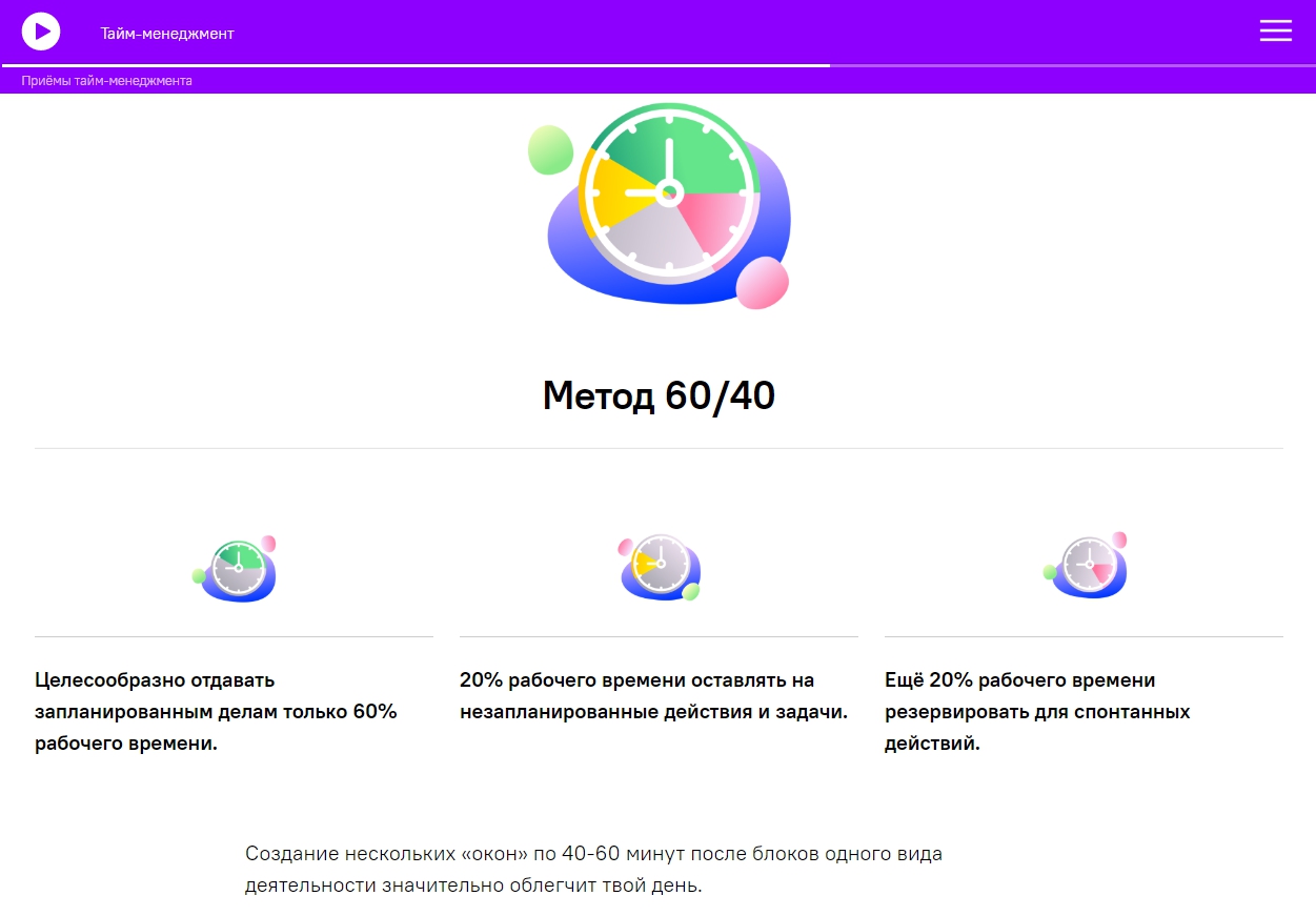 Хороший баланс дизайна и подачи материала. Концентрированные материалы, много лайфхаков, нет воды. Грамотный подход к содержанию, методологии, визуальной составляющей. А на основе курса про "Наставничество" мы планируем разработать программу обучения для сотрудников.