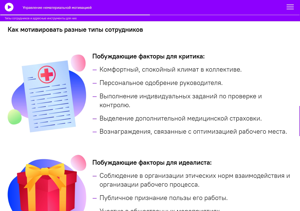 Потренироваться в подборке методов и технологий нематериального стимулирования.