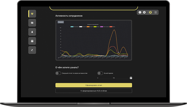 - Отчёты - сводные и точечные по активностям подчинённых - доступны руководителю в интерфейсе пользователя